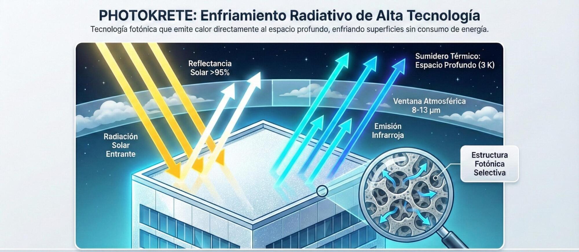 • Gestión Fotónica Activa: Reflejo del 95% de la radiación solar con emisión térmica simultánea, incluso bajo sol directo (Enfriamiento Radiativo Diurno).